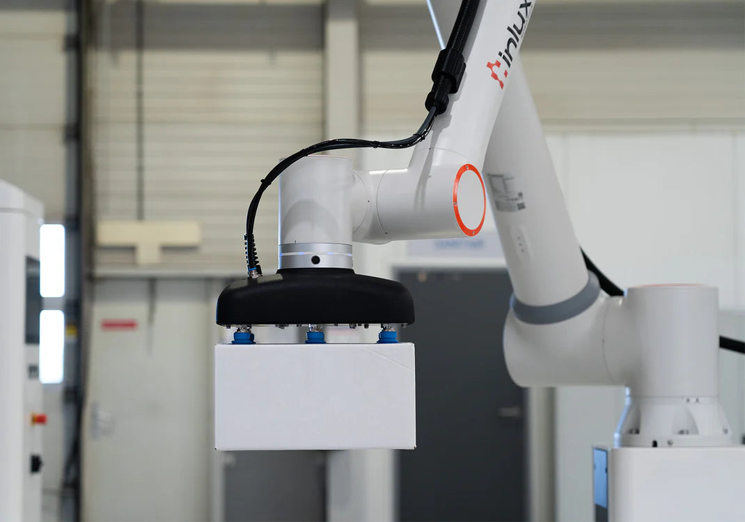 Avec un cobot, les produits peuvent être automatiquement empilés sur des palettes selon un schéma fixe. Cela évite aux employés de soulever des charges lourdes et garantit une palettisation cohérente et efficace. Les cobots sont flexibles et peuvent être facilement adaptés à différentes boîtes ou produits.